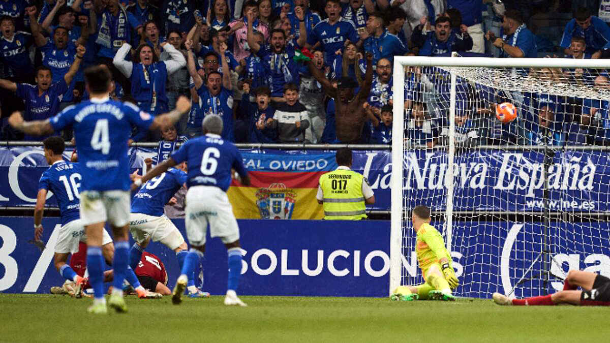 CAZORLA aguantó hasta el minuto 72 y poco después saltó al campo PORTILLO, con una misión parecida y que iba a ser otra figura determinante. Se había incorporado en el mercado de invierno y tenía la curiosa marca de haber ascendido las cuatro veces que había jugado en 2ª división (con el Betis, el Getafe, el Almería y el Leganés). Con los azules firmaría la quinta y con gran protagonismo, pues cuando se disputaba el minuto 103 controló un balón suelto que llegó a su posición ligeramente adentrado enn el área y tras dejarlo botar enganchó un disparo a la media vuelta que se alojó en la meta del conjunto castellano cerca de la escuadra derecha, sin que nada pudiese hacer el guardameta del Mirandés. Ahí sí, tras 24 años de penurias el Tartiere fue consciente de que el Real Oviedo por fin regresaba a 1ª división. Ya no se podía escapar. |