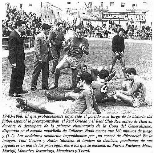Años más tarde, en la temporada 1967/68, antes de que el cambio en la normativa impidiese este tipo de situaciones con la implantación de las tandas desde el punto de penalty para dilucidar los empates en las eliminatorias de la competición del K.O., disputaría el Real Oviedo otra eliminatoria copera que también pasaría a la historia por su duración. Aunque en esta ocasión sólo se disputaron tres encuentros, por un lado el tiempo transcurrido entre el primero y el último resultó enorme y, además, para dilucidar las tablas, en el desempate se sucedieron las prórrogas (una de 30 y hasta cuatro de 10 minutos) y se tuvo que decidir al clasificado aplicando una rebuscada norma federativa que premiaba al equipo que mayor número de saques de esquina hubiese forzado. Tras las prórrogas se clasificó el Recreativo por haber lanzado 9 córners por 8 del conjunto oviedista. |